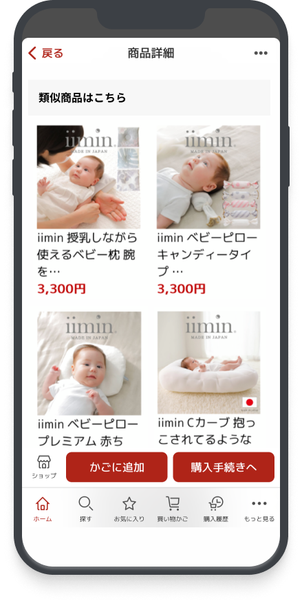 スマートフォンの各商品ページ内に「類似商品」「同時購入されやすい商品」「楽天ランキング1位獲得アピール」などの情報を自動的に掲載することができます。